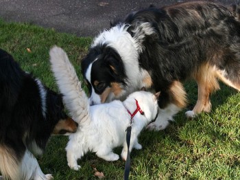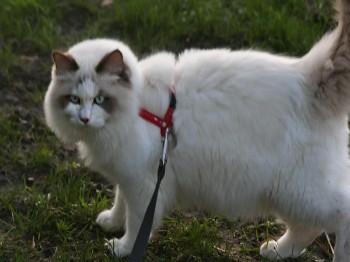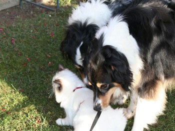 | Von Anfang an genießt Cosmo die Nähe zweier süßen australian Shepherd Hunden - Finn und Bolle. Obwohl Cosmo noch nie zuvor einen Hund gesehen hat! An diesem Bespiel wird wieder einmal der besondere Ragdollcharakter deutlich. Neulich hat Frauchen Cosmo eine Leine gekauft. Cosmo hat sie sofort angenommen und freute sich riesig mit den Hunden rausgehen zu dürfen! Finn und Bolle fanden es erstmal recht seltsam, wie man auf den Foto´s sehen kann, aber letzendlich sind sie alle zusammen - Hund und Katze - auf die "Maulwurfjagt" gegangen..... Liebe Peggy, vielen Dank für die tollen Bilder! .....Bilder finden sie hier |