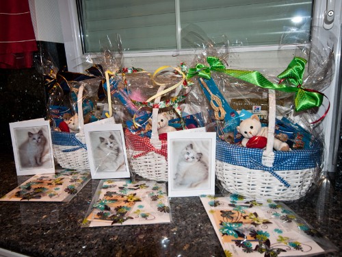 Es sind einige Geschenke: neue und geliebte Spielzeuge der Kitten, sowie eine CD mit der Entwicklung ihres Lieblings, Kuschelhöhle oder Decke, Futter etc.